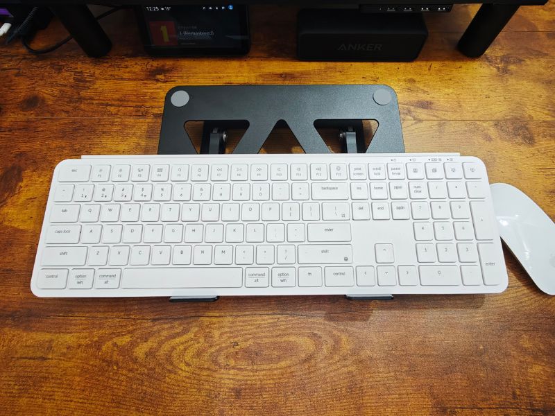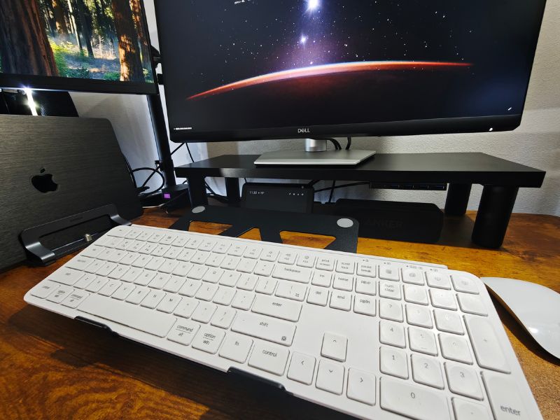 仕上げに、このモニタースタンドの側面に「Anker USB3.0 ウルトラスリム 4ポートハブ」を両面テープで固定。これにより、手元でスマホのUSB充電やマウスの充電が可能になり、配線もスッキリしました。